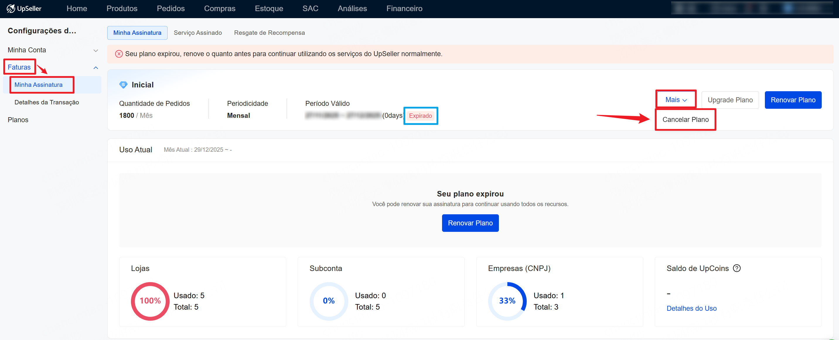 Situação 2: quando o seu plano já expirou e você deseja fazer downgrade. (É permitido downgrade para o Plano Gratuito)