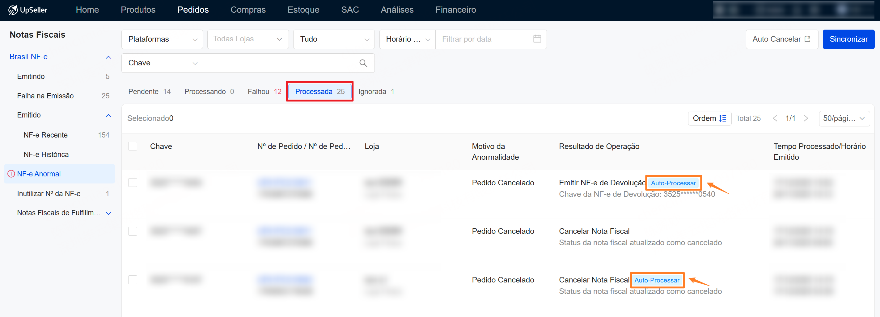 As notas com cancelamento bem-sucedido ou emissão de devolução bem-sucedida serão movidas para o status "Processada", com identificação de "Auto-Processar".