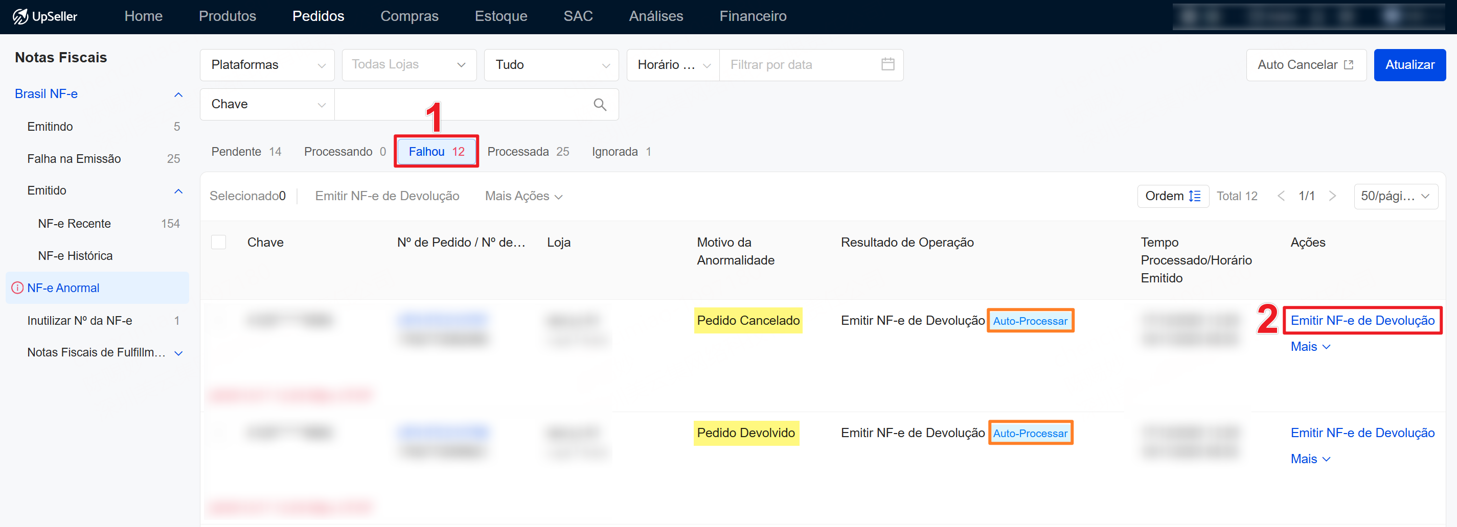 As notas com falha no cancelamento ou falha na emissão da devolução serão movidas para o status "Falhou", também com identificação de "Auto-Processar".