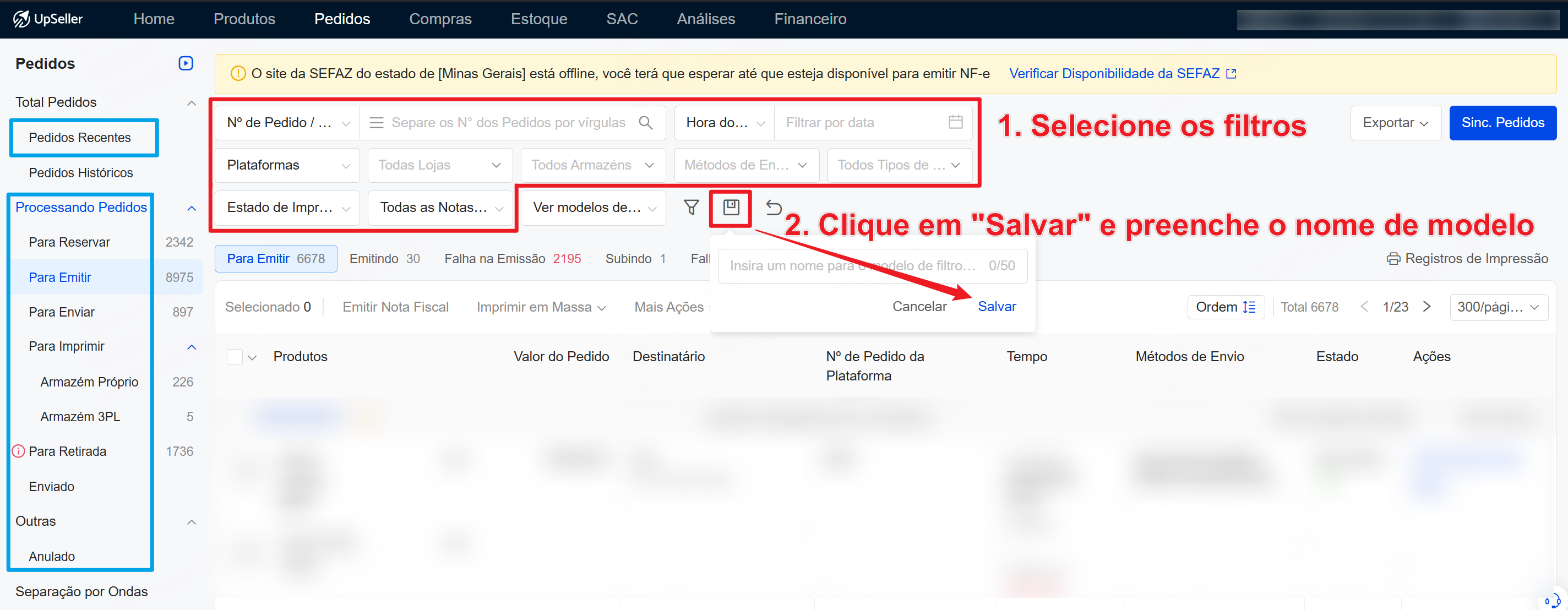 Nas páginas "Pedidos Recentes", "Processando Pedidos" e "Anulado" >> Selecione os critérios de filtro desejados >> Clique em "Salvar" e informe o "Nome do modelo de filtro" para criar um novo modelo.