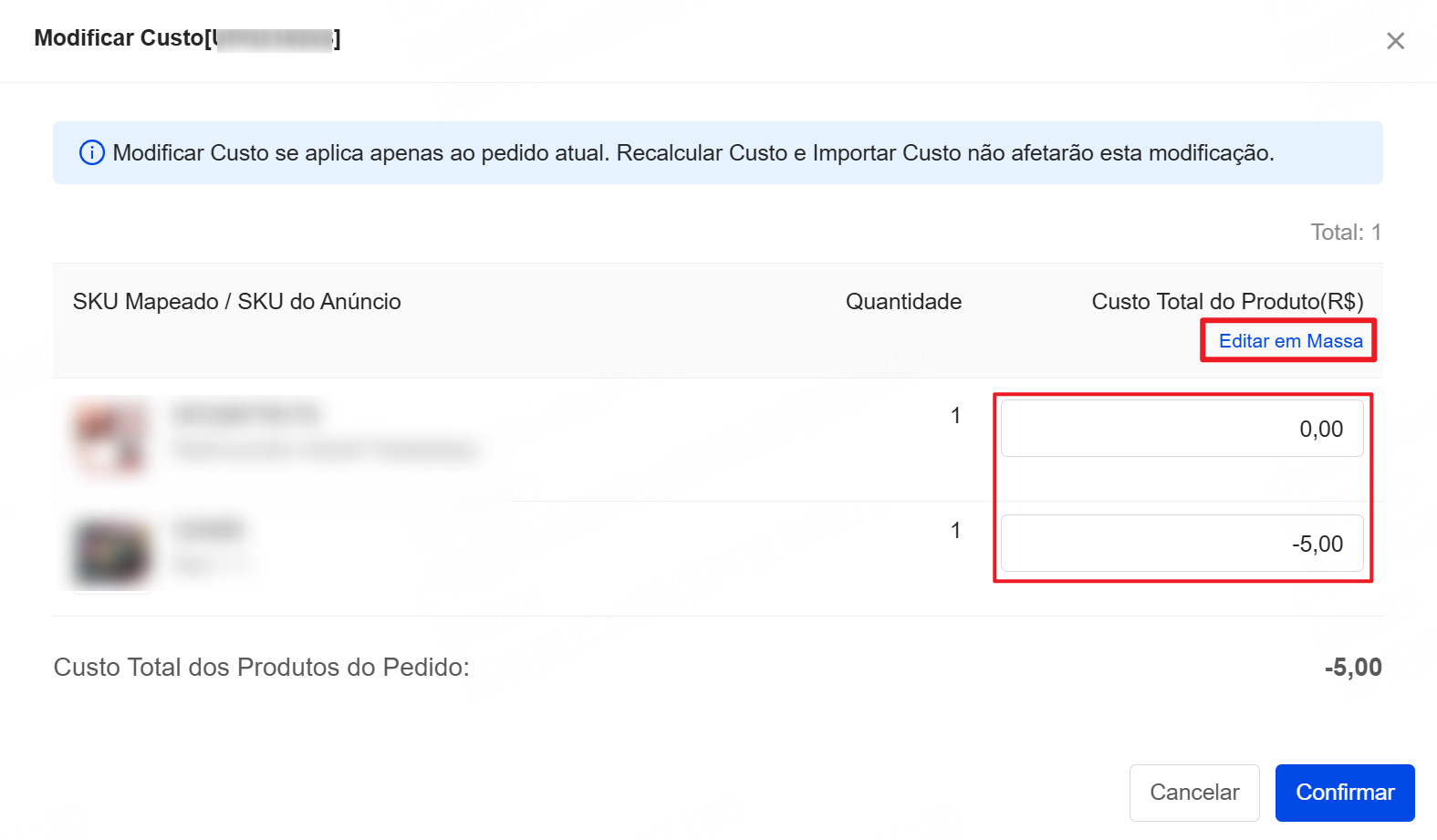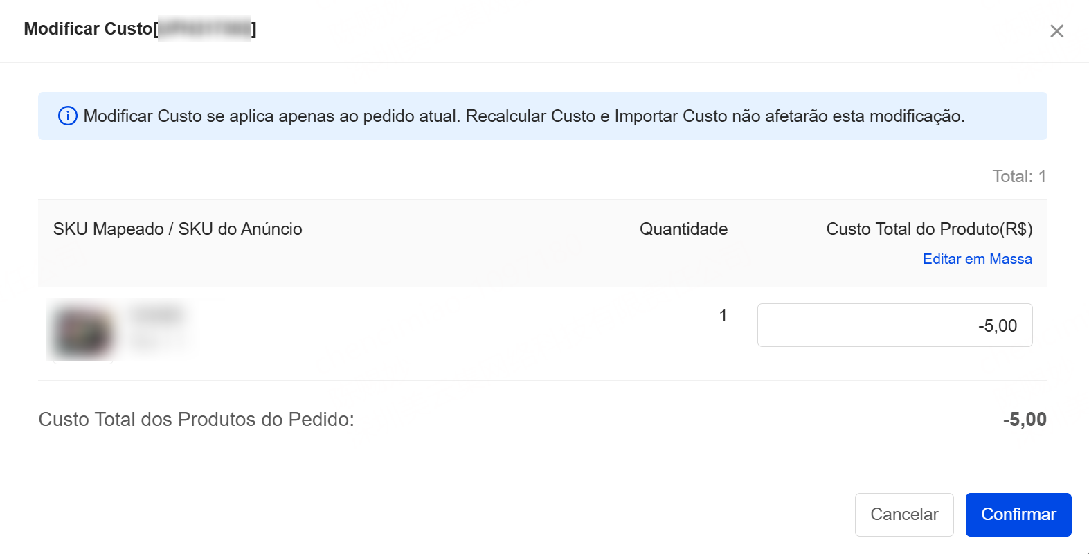 1. Após a modificação do custo do pedido, o lucro do pedido será recalculado imediatamente; o lucro da loja será recalculado e atualizado no dia seguinte.