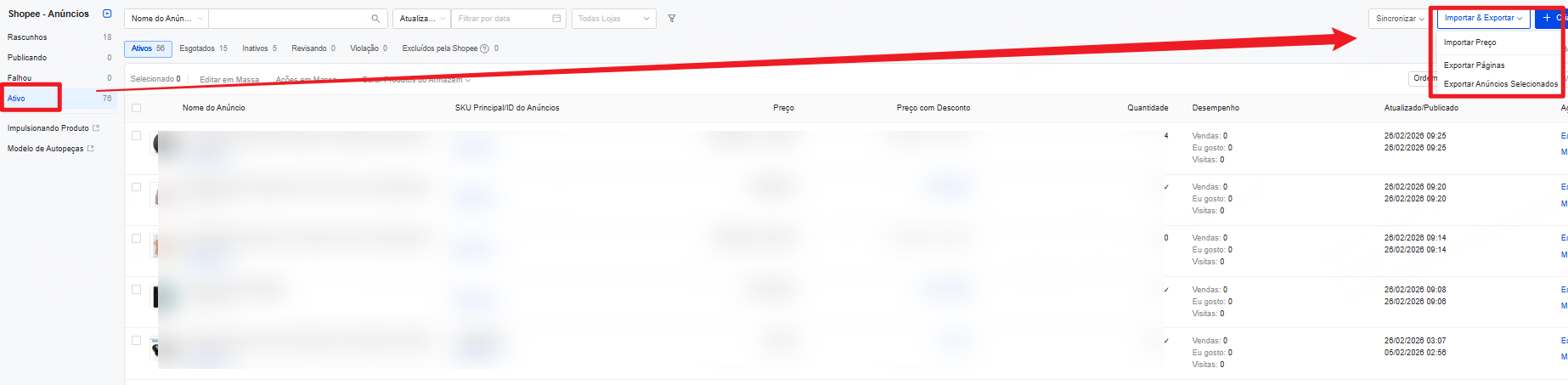Clique no módulo [Produtos] >> Shopee >> Anúncios Ativos >> Clique em “Importar & Exportar” >> Selecione “Importar Preço”.