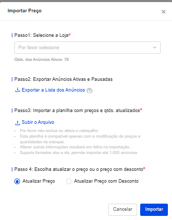 Atenção: A quantidade de anúncios ativos corresponde ao número total de anúncios ativos, esgotados e inativos nas lojas selecionadas. Ou seja, é suportado modificar os preços e preços com desconto dos anúncios nesses três status.