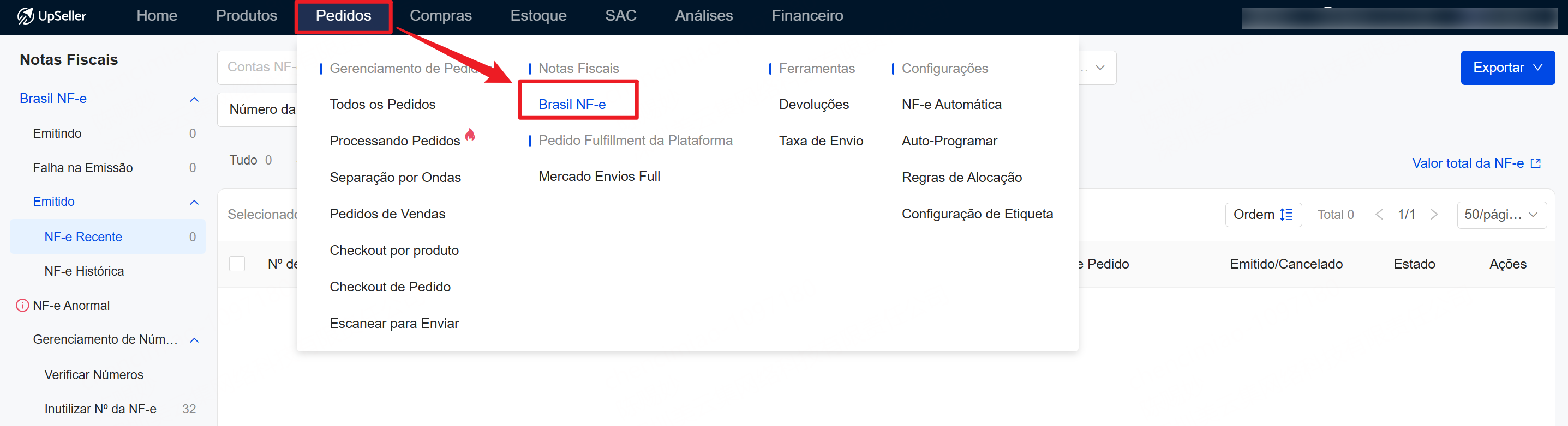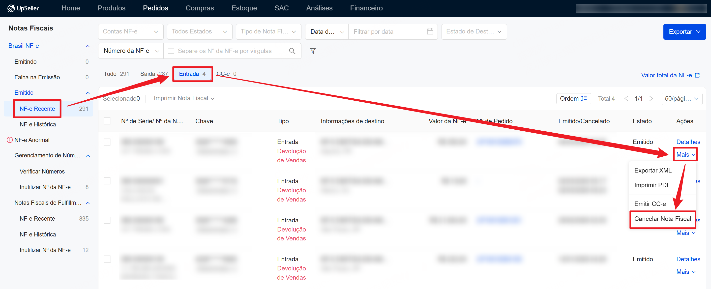 2. O cancelamento é permitido apenas para as notas de devoluções em NF-e Recente.II. Como cancelar a NF-e de Devolução emitida no UpSeller?