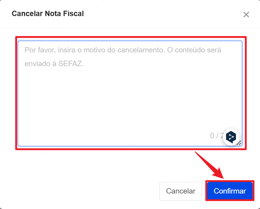 3. Preencha o motivo do cancelamento da nota fiscal e clique em Confirmar.