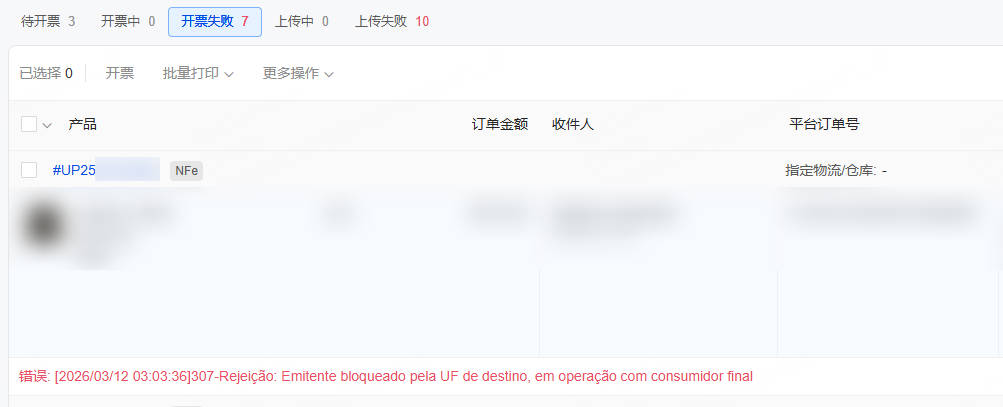 307-Rejeição: A empresa emissora da nota fiscal foi restringida pelo governo do estado de destino, resultando na falha na emissão da nota.