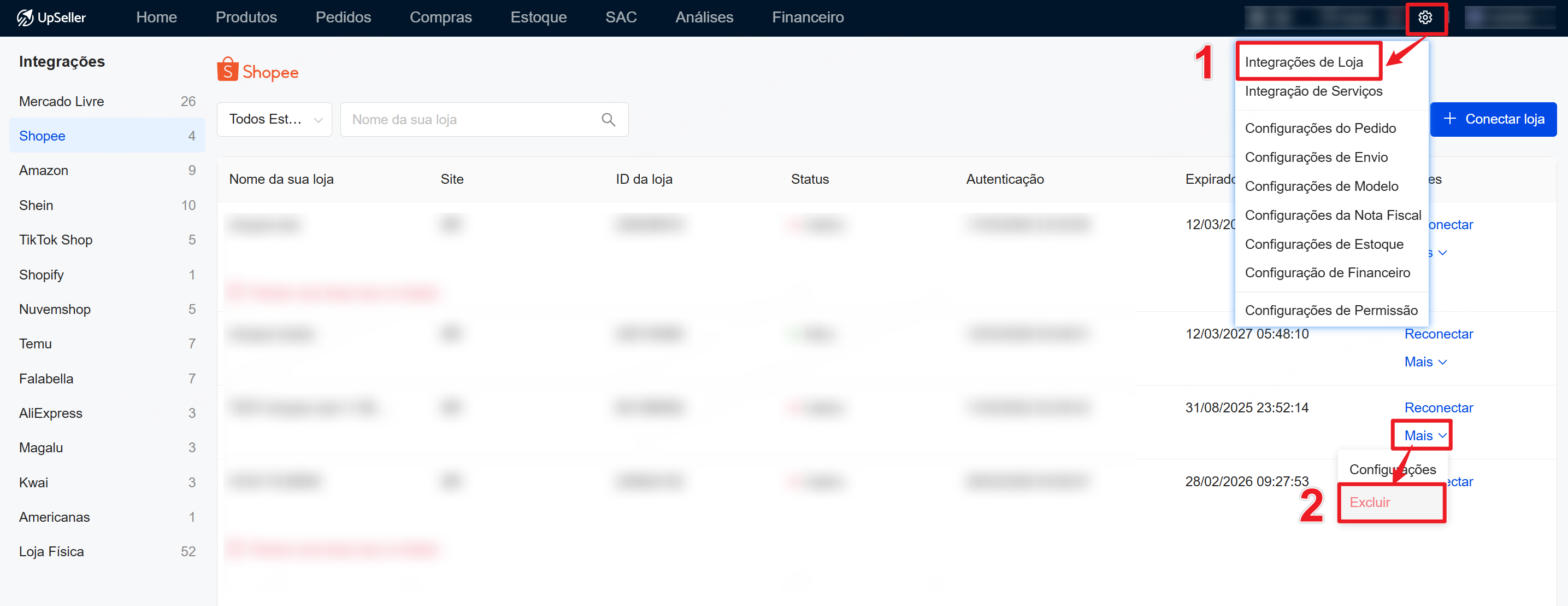 Login na conta principal UpSeller >> Configurações >> Integrações de Loja >> Selecionar a Loja >> Mais >> Excluir