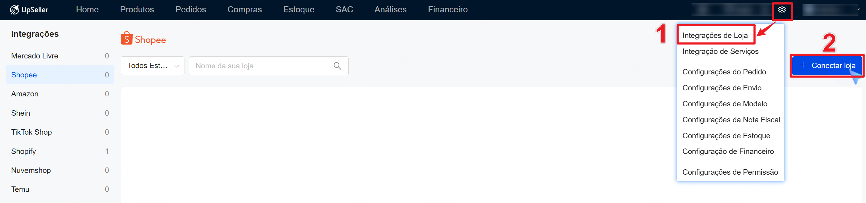 Login na conta principal UpSeller >> Configurações >> Integrações de Loja >> Selecionar plataforma >> Conectar a loja
