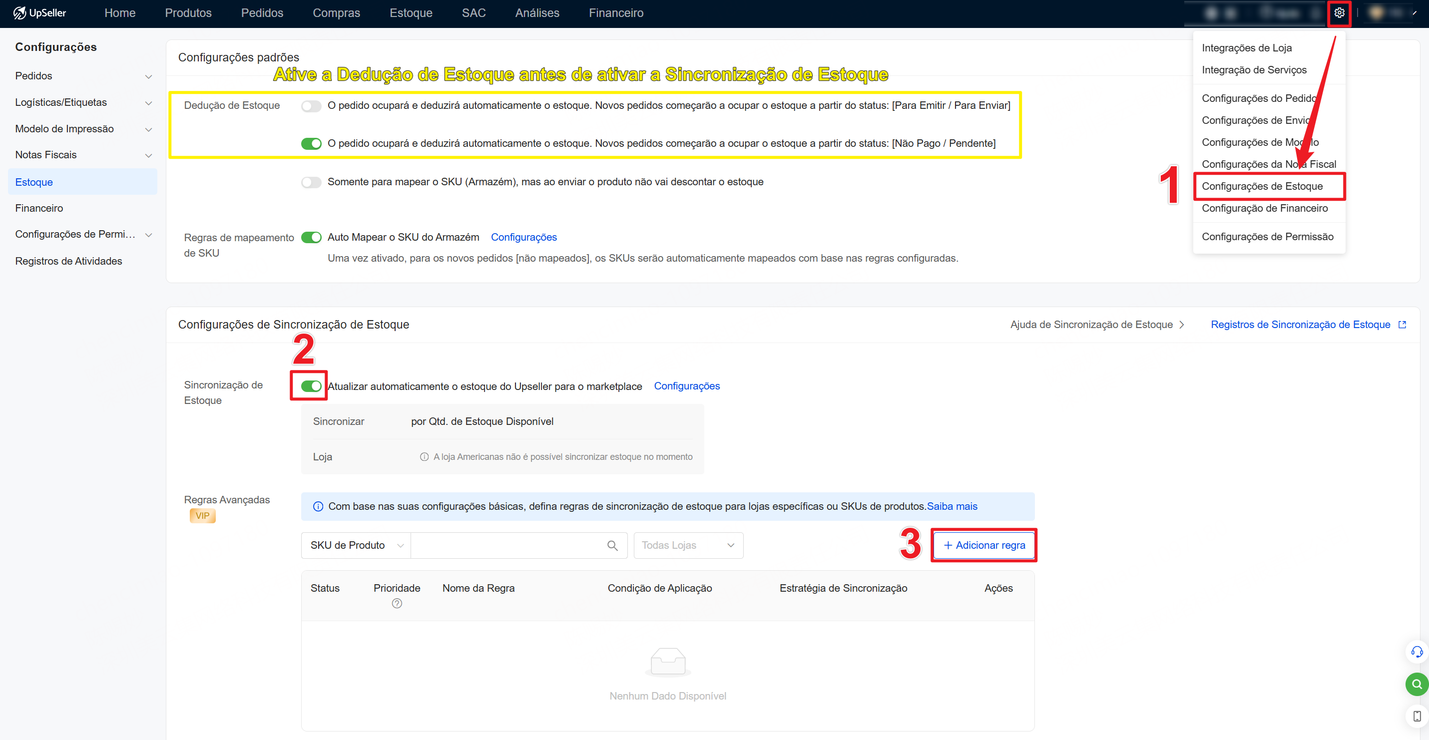 OBS: Ative a Dedução de Estoque antes de ativar a Sincronização de Estoque.