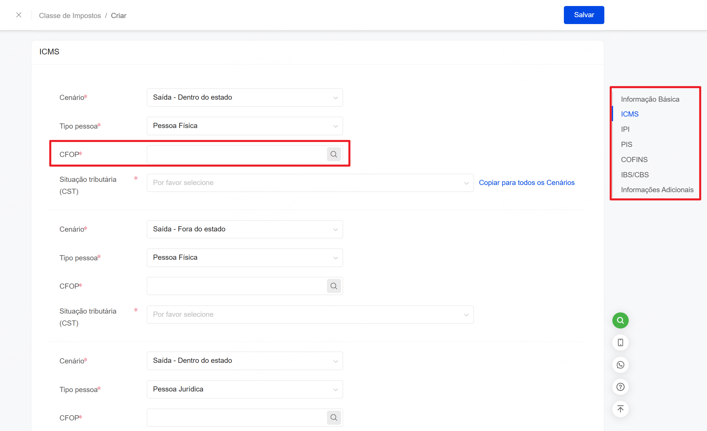 4. Depois de colocar as informações básicas, você também precisa colocar ICMS, IPI, PIS, COFINS, IBS/CBS e Informações Adicionais.