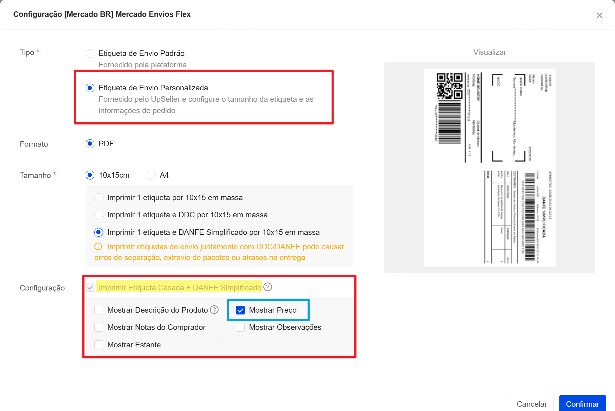 Se for necessário exibir informações adicionais no DANFE: Configurações de Envio >> Selecionar a plataforma >> Configuração de Etiqueta >> Etiqueta de Envio Personalizada >> Imprimir Etiqueta Casada + DANFE Simples >> Marque "Mostrar Preço"