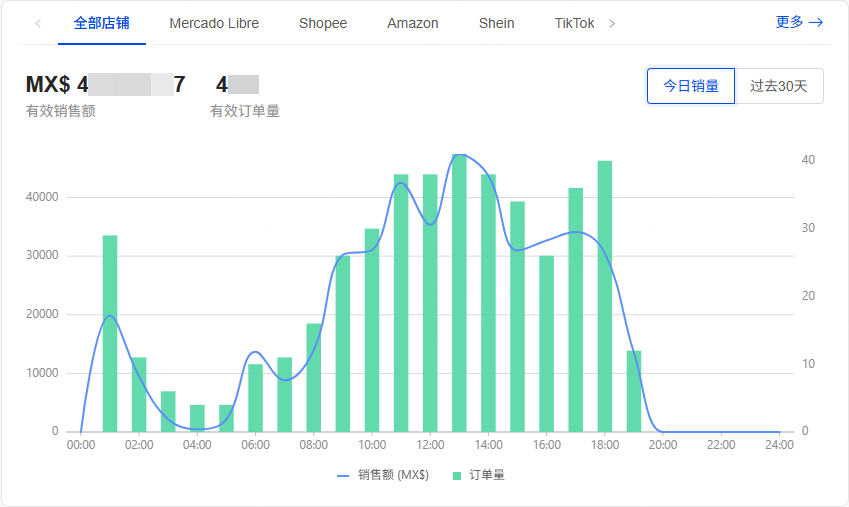 业绩统计:汇总统计所有店铺 今日 和 过去30天 的 有效订单量 和 有效销售额,在 过去30天 中您可以点击图表查看每天的订单数量和销售额。如果您授权多个平台的店铺,也可以分平台具体展现业绩统计,点击“更多”,将跳转到销售报表的 业绩概览