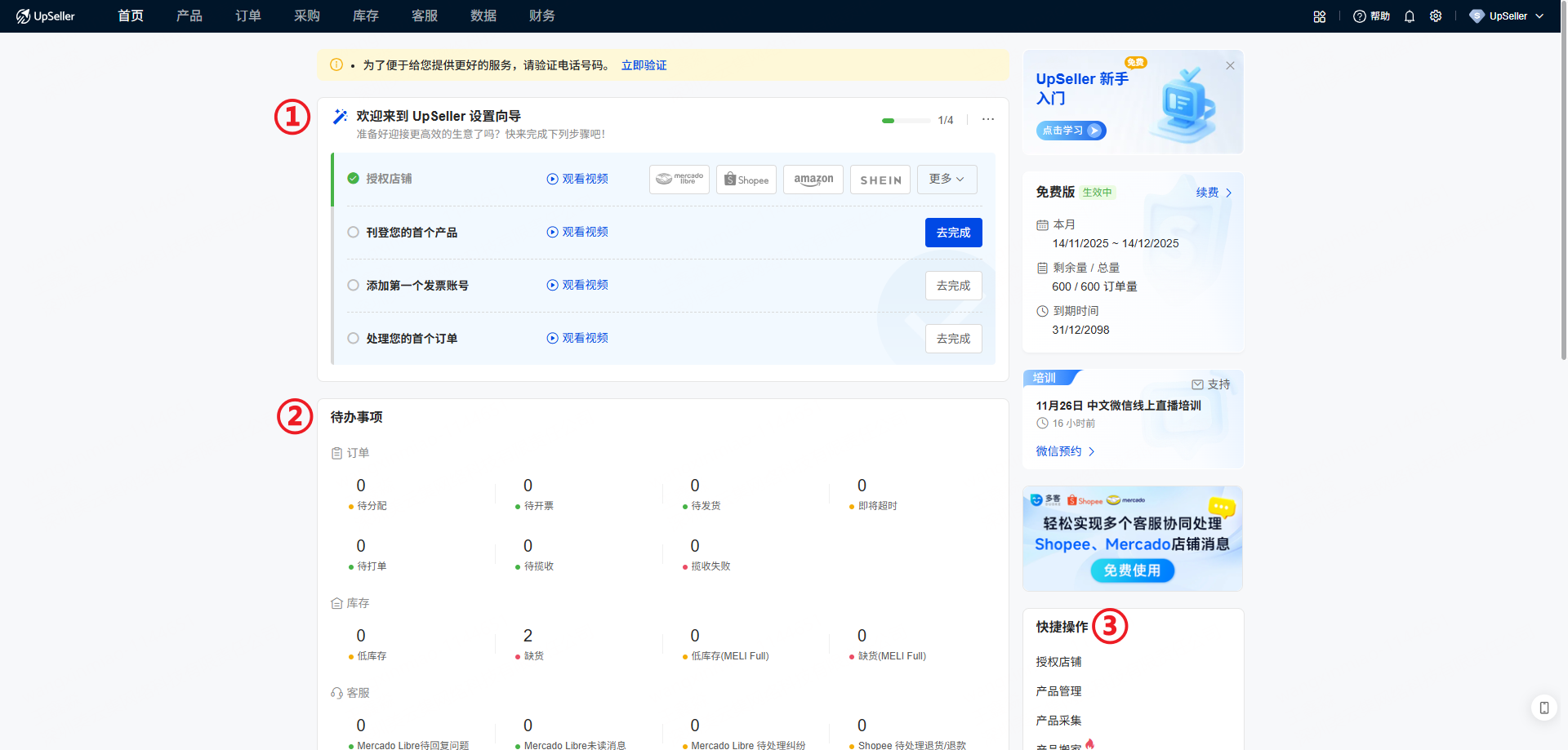 ① UpSeller设置向导:当授权店铺后,可引导快速完成四大操作(右上角进度条代表任务完成情况)