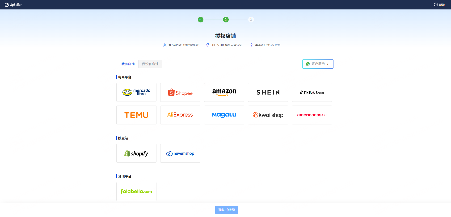 第三步:选择需要授权的店铺,并跳转到授权界面,完成店铺授权后,再次点击平台图标以授权更多店铺;或者选择“我没有店铺”,填写原因并点击“确认并继续”进入下一步