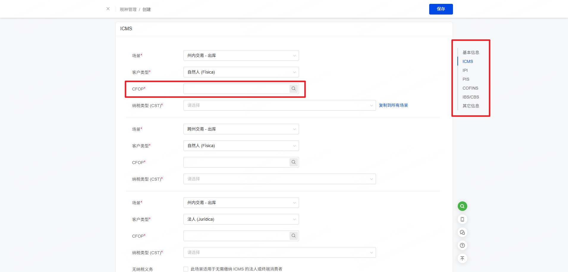 3、在税种设置详情页还可进行其他税种信息编辑,包括:基本信息,ICMS,IPI, PIS, COFINS, IBS/CBS 等。