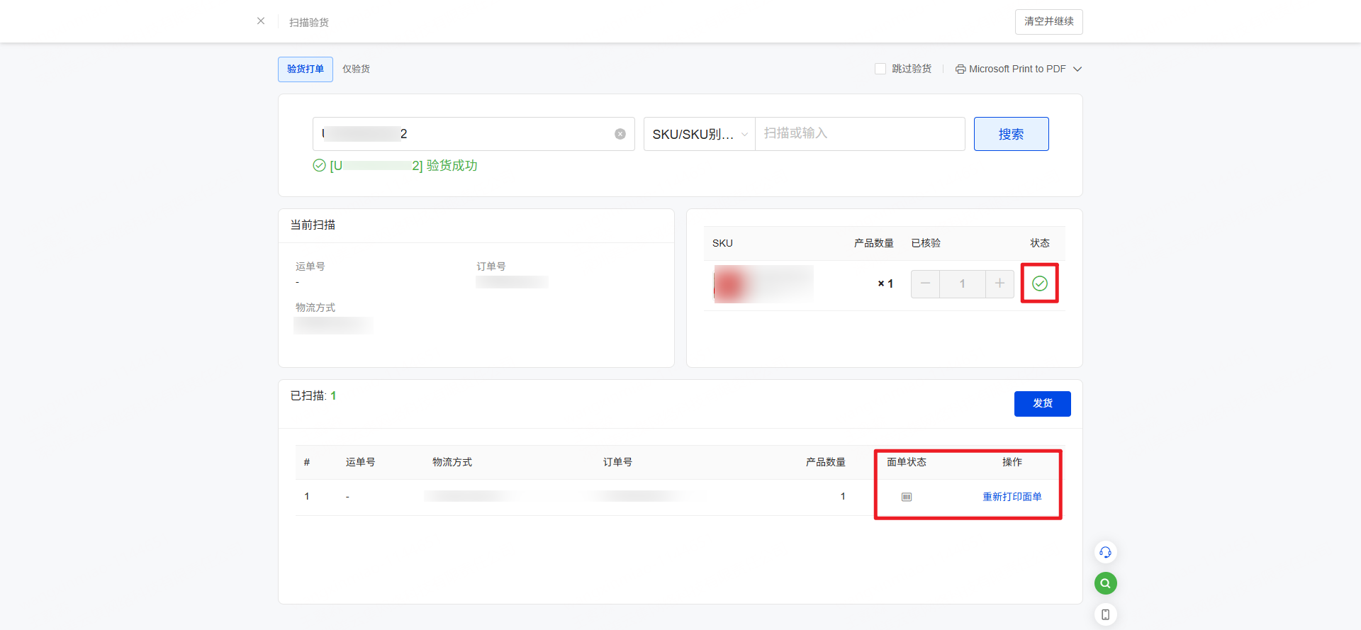 第四步:产品核验成功后,系统会自动打印面单,打印完毕后面单状态显示绿色。若遇到特殊情况,支持重新打印面单