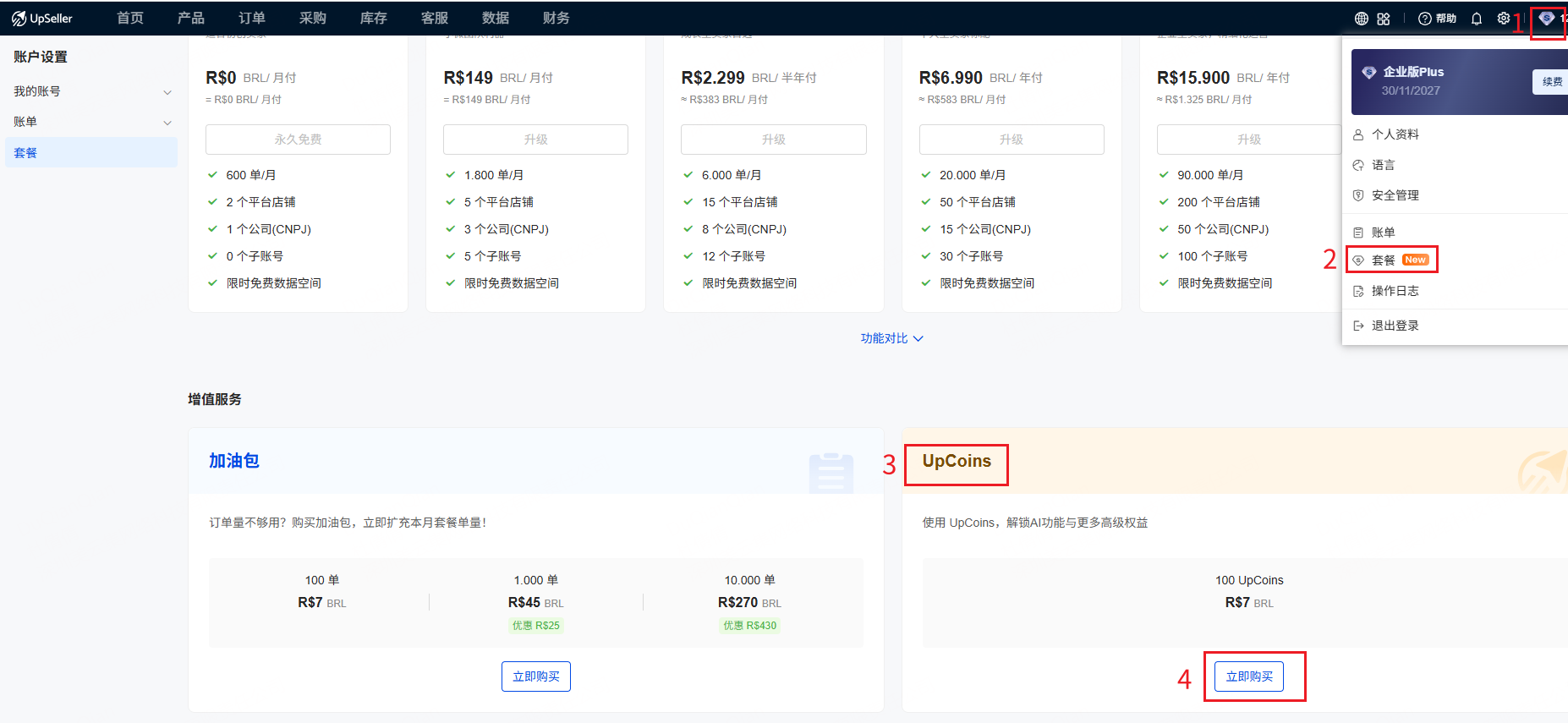 注意:充值前请先购买 UpCoins,套餐充值成功后 UpCoins 无法退回。同时也支持在套餐到期前进行续订和升级套餐