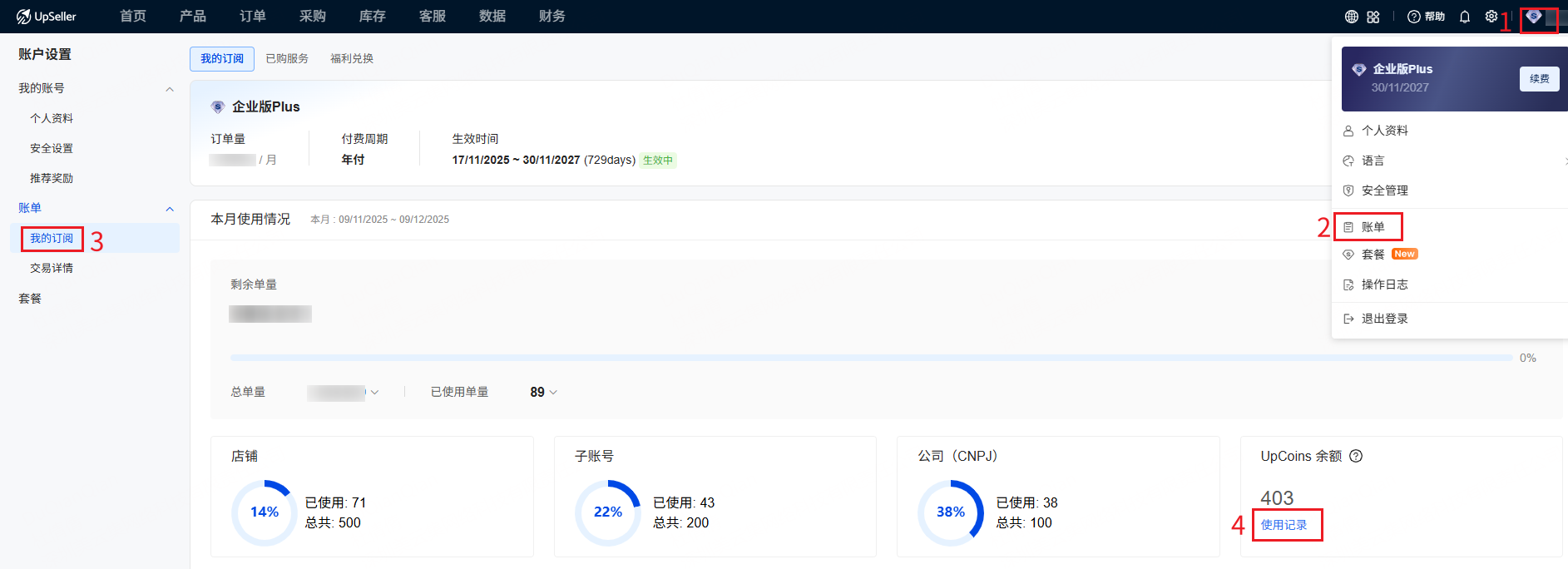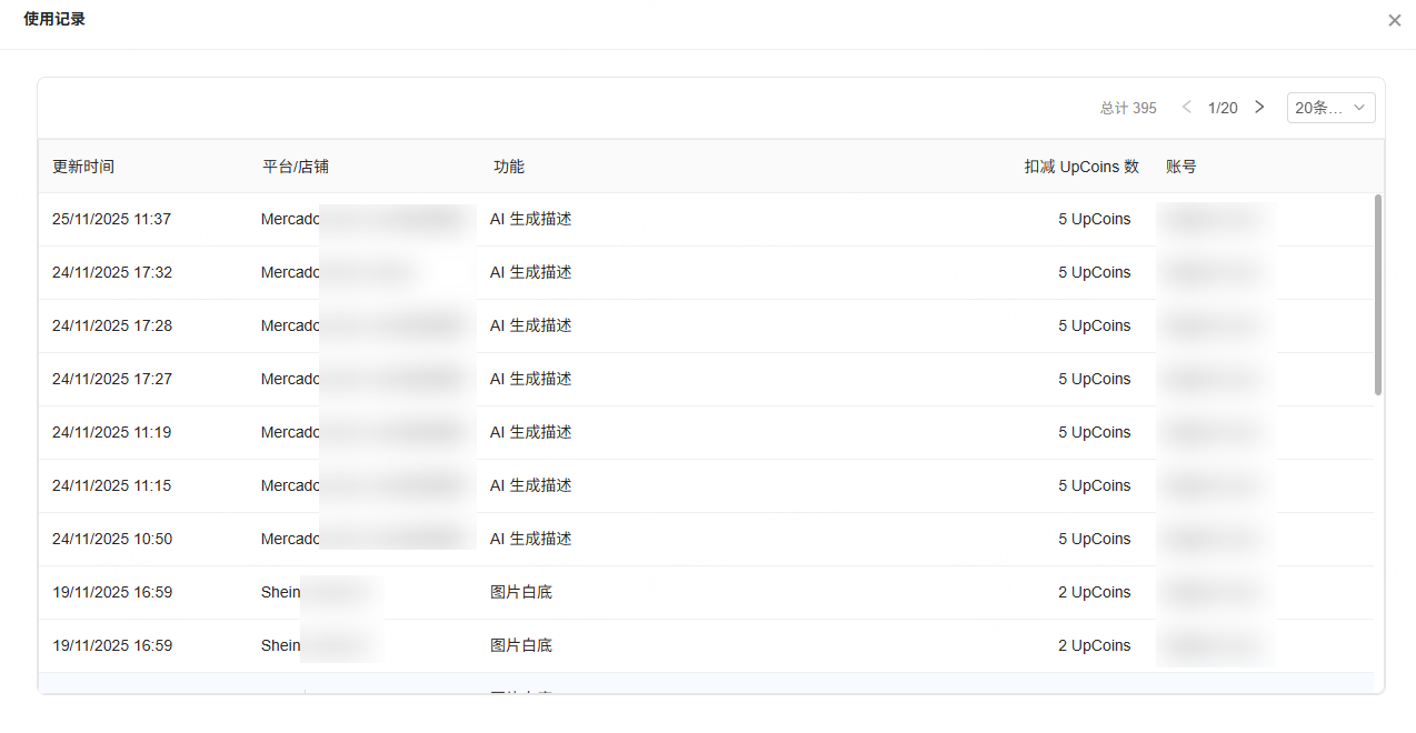 前往 个人账号>>账单>>我的订阅>>使用记录 ,可具体查看使用UpCoins时间、使用店铺名称、具体功能等信息