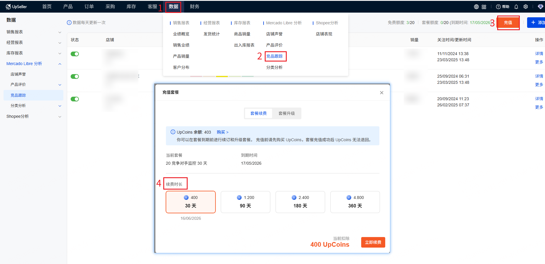 现不同套餐版本最多可免费添加的竞品店铺数量不同。如需跟踪更多的竞品,需要充值套餐。了解如何使用“竞品跟踪”功能,具体可参考>> https://www.upseller.com/zh-CN/doc-article/508