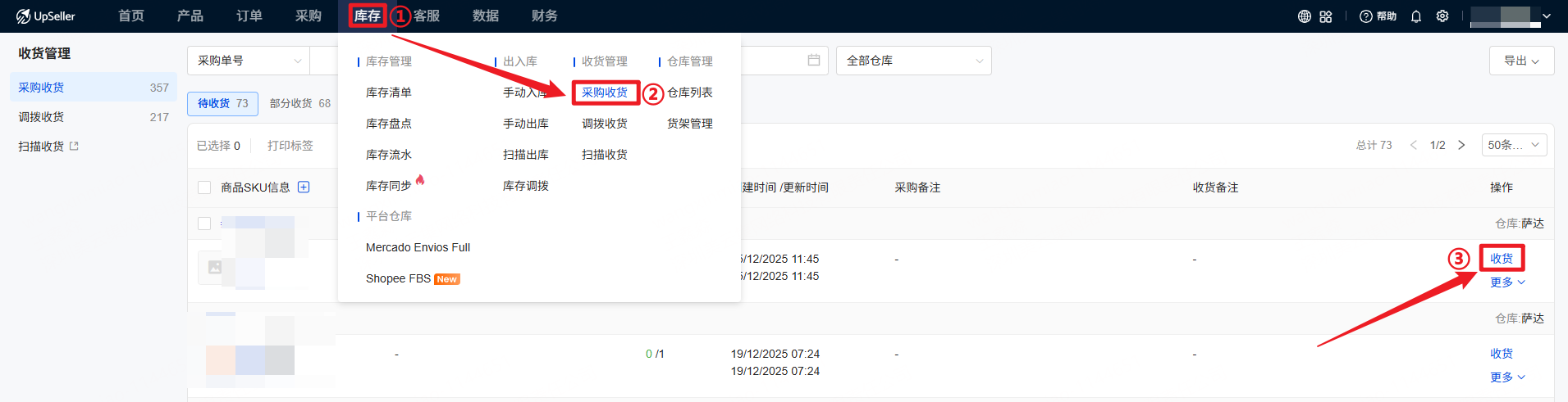 采购收货入口二:【库存】>> 收货管理 >> 采购收货列表 >> 收货