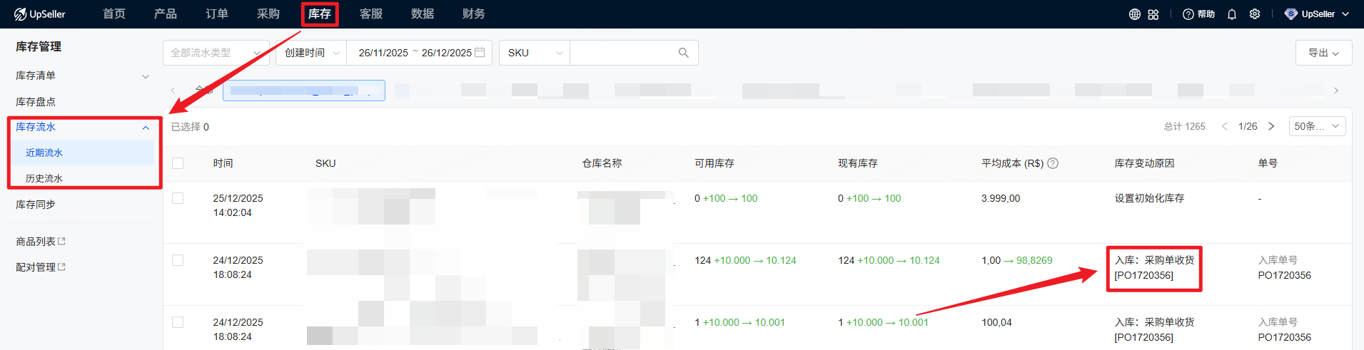 A1:会的。在 库存>>库存管理>>库存流水中查看,库存变动原因为采购单收货
