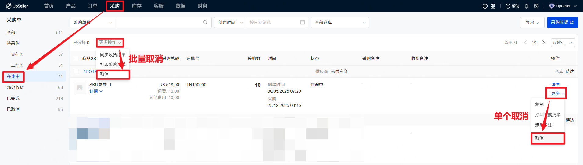 A2:可以的。在【在途中】状态下,选择需要取消的采购单,点击“取消”即可。当该采购计划被取消后,采购单进入【已取消】状态
