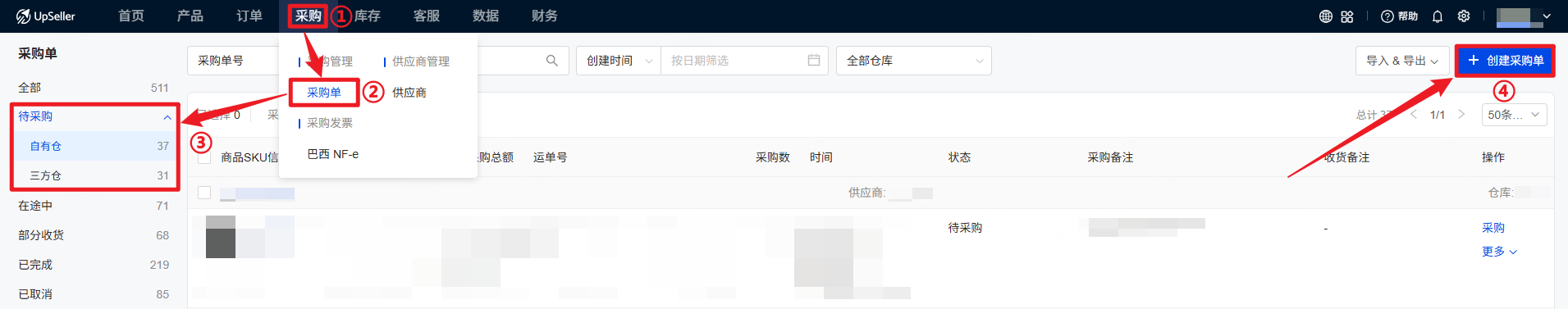 第一步:点击 采购 >> 采购单 >>“待采购”状态 >> 创建采购单