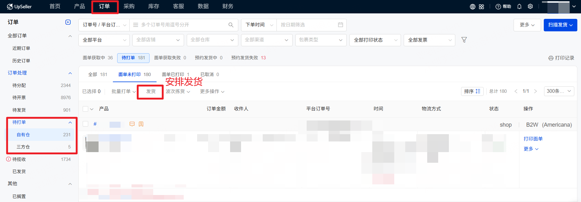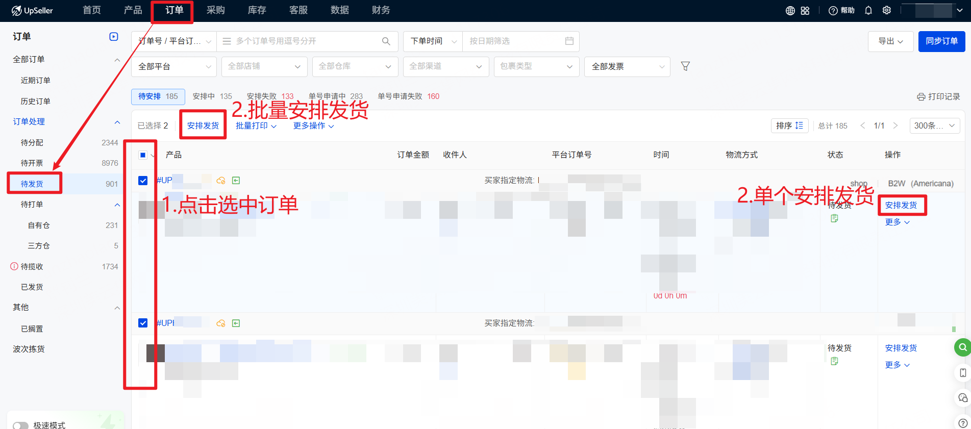 2) 待发货:用户可以在“待安排”列表安排所有需要发货的订单。点击“安排发货”,可单个/批量安排,系统会自动处理之后的子状态(安排中、获取运单号中)