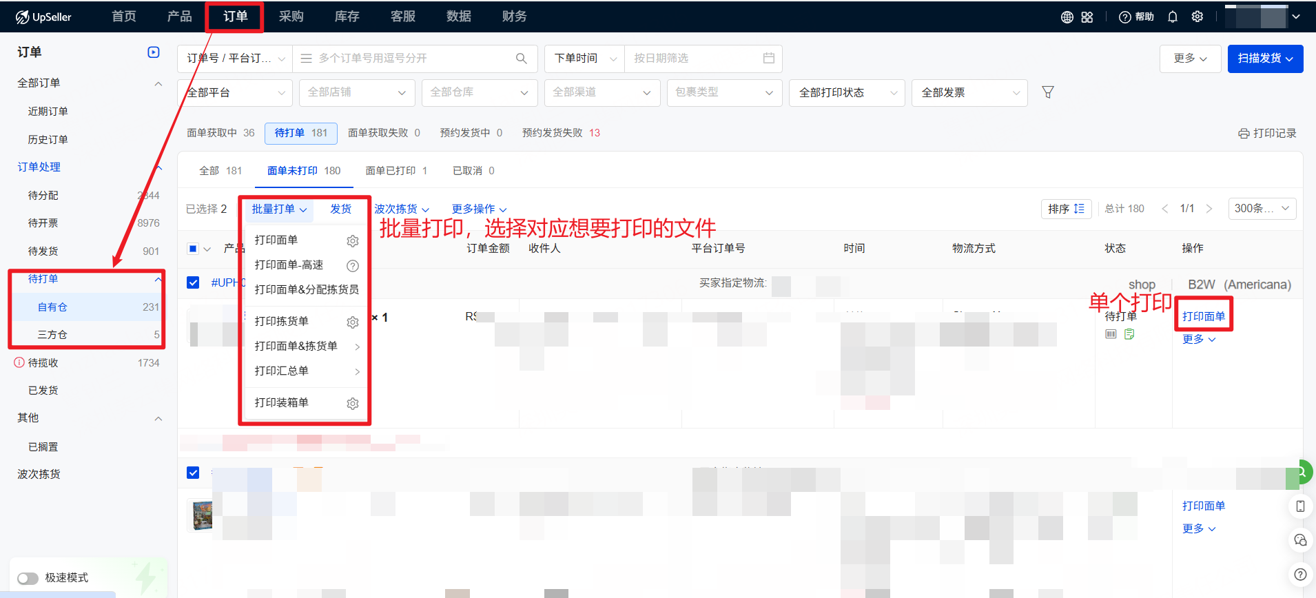 3) 获取PLP成功后,订单会自动流转到“待打单”状态,选中产品后点击“打印面单“。如果PLP文件获取失败,则需要重新“获取面单”。批量打印面单需要先筛选物流,目前只支持同一物流的面单批量打印。注意:Americanas(B2W)订单的打印面单即为打印PLP文件