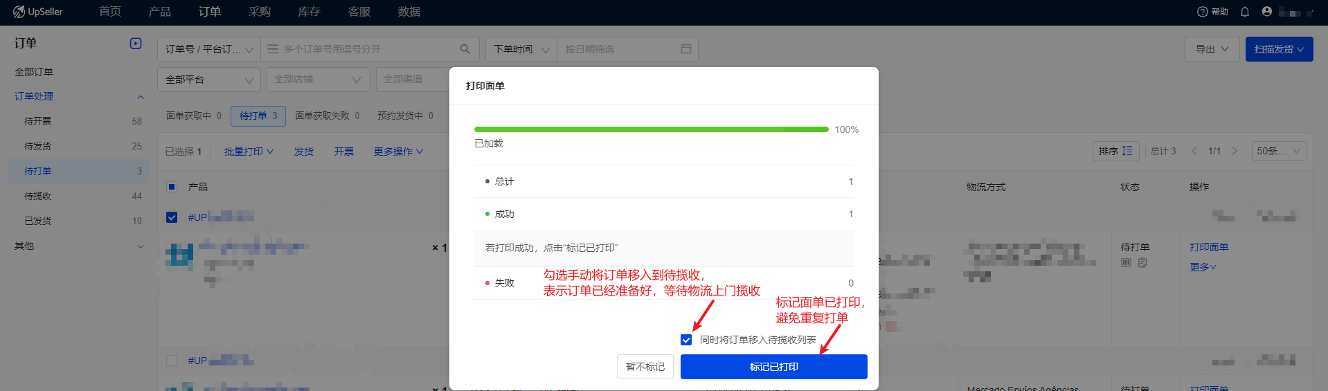 打印面单时,可点击”标记已打印“,目的:帮助区分哪些面单已打印。