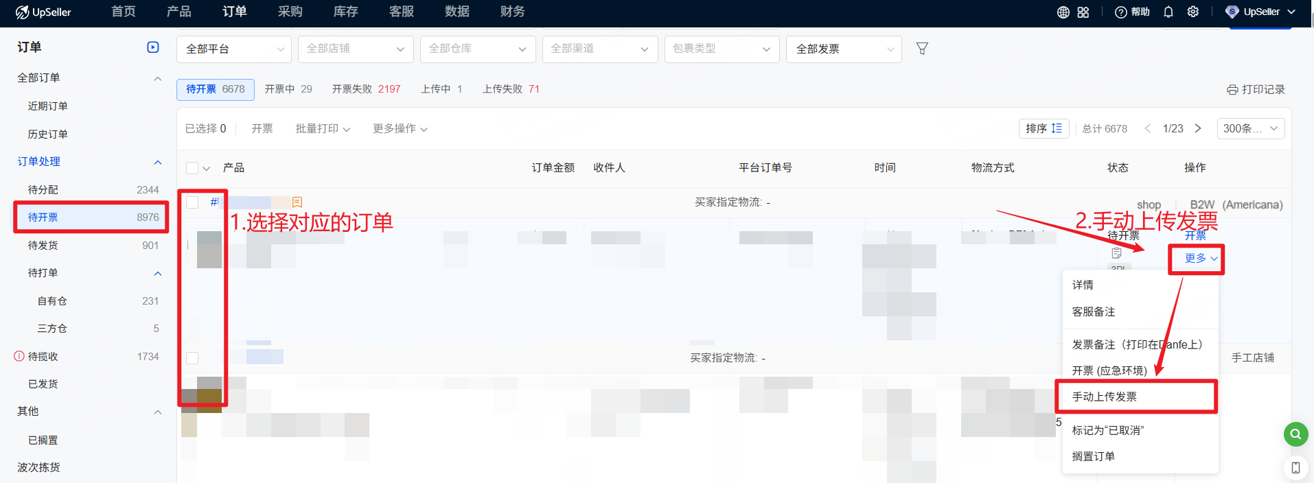 1)待开票 :用户可以在“待开票”列表上上传发票号,点击更多>>手动上传发票