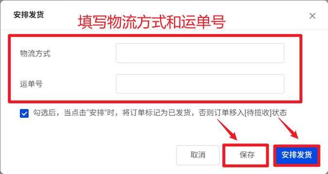 2)待发货:用户可以在“待安排”列表手动上传运单号。点击“物流信息”,输入运单号,勾选”点击安排向平台提交订单已发货”,支持“保存” 或 “保存并安排”。点击“保存”只保存数据,订单还在“待发货”状态。点击“ 保存并安排”,订单则移入“已发货”状态下。
