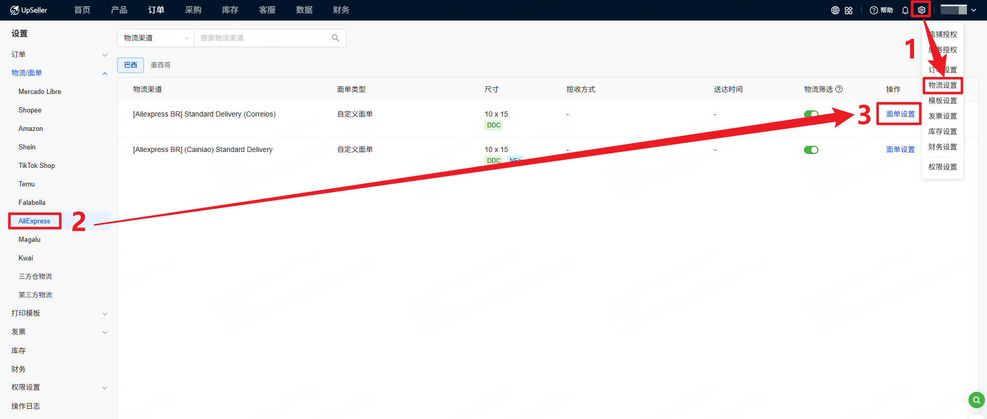 第一步:点击设置>>物流设置>>选择Aliexpress平台,选择相应的物流后点击设置,开始设置面单的格式