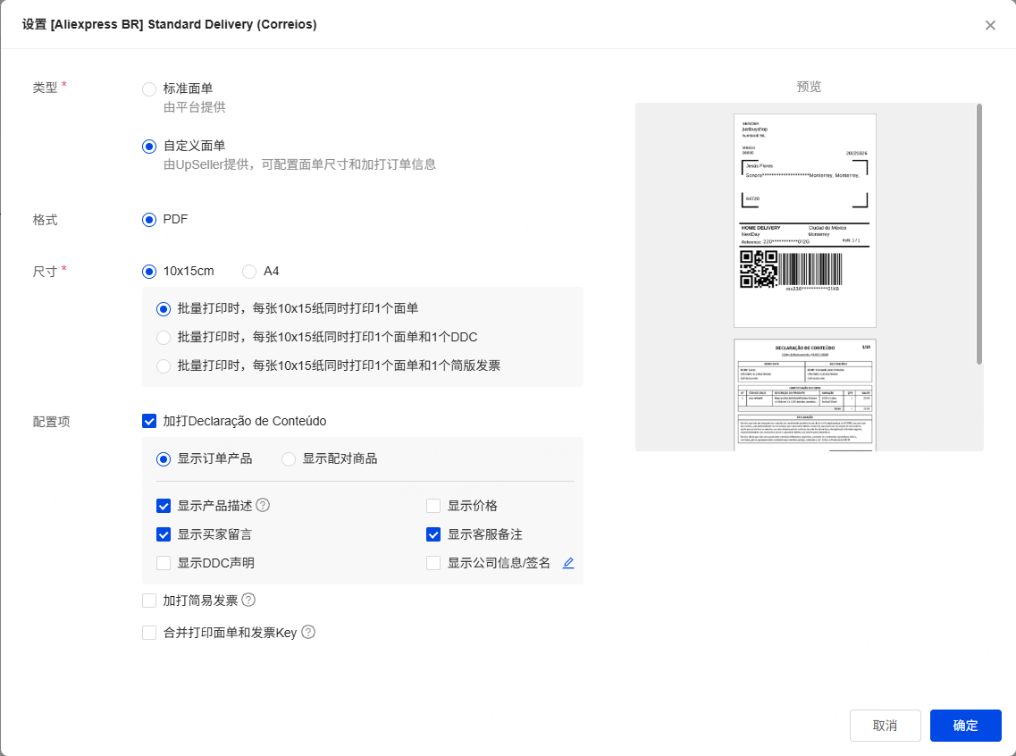 第二步:根据实际需求选择10x15或者A4格式的面单。选择是否加打Declaração de Conteúdo和简易发票,并对Declaração de Conteúdo和简易发票做相应的信息展示设置,设置完成之后点击保存即可