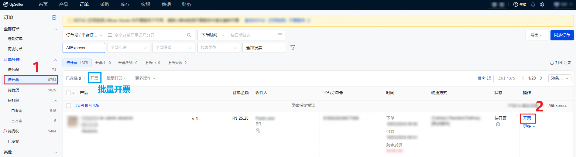 1、进入【待开票】点击 “开票”,系统自动上传发票至 AliExpress。