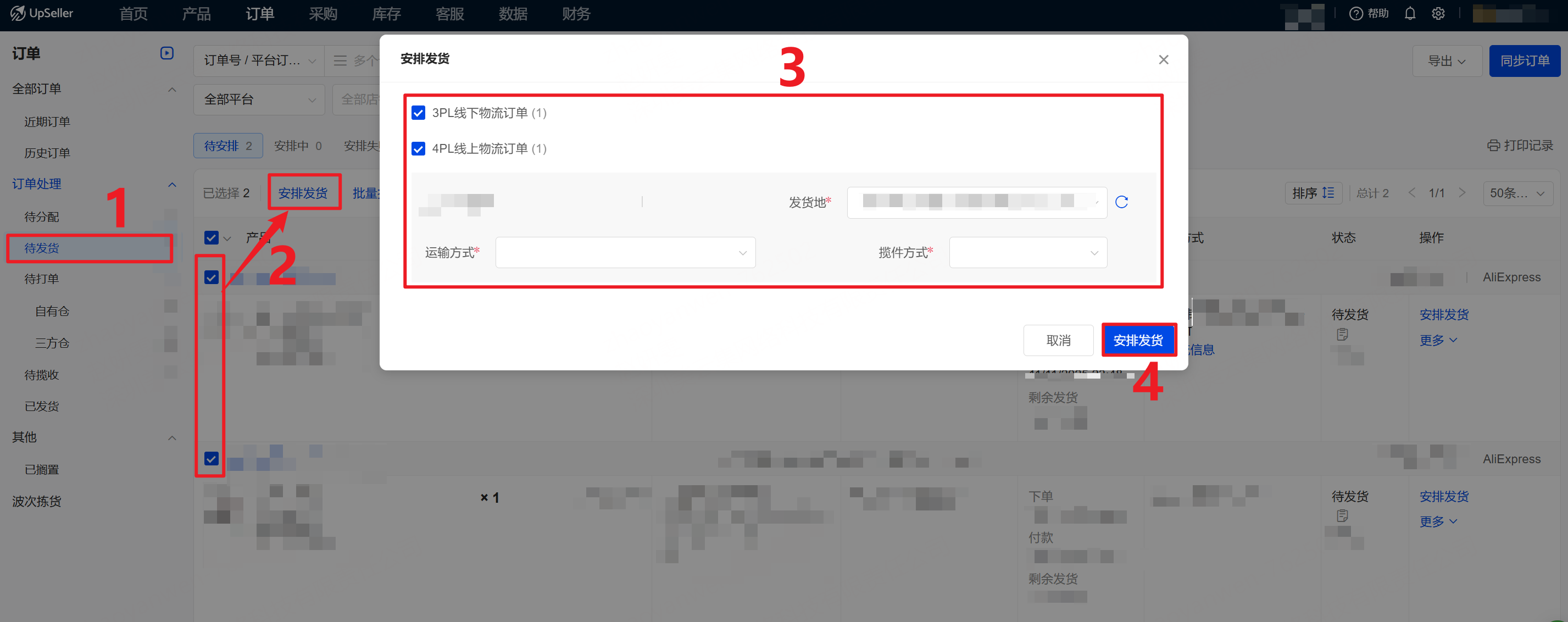 勾选订单,点击安排发货>>按店铺选择发货地,物流渠道和揽收方式>>点击安排发货,自动获取单号,订单将自动进入【待打单】