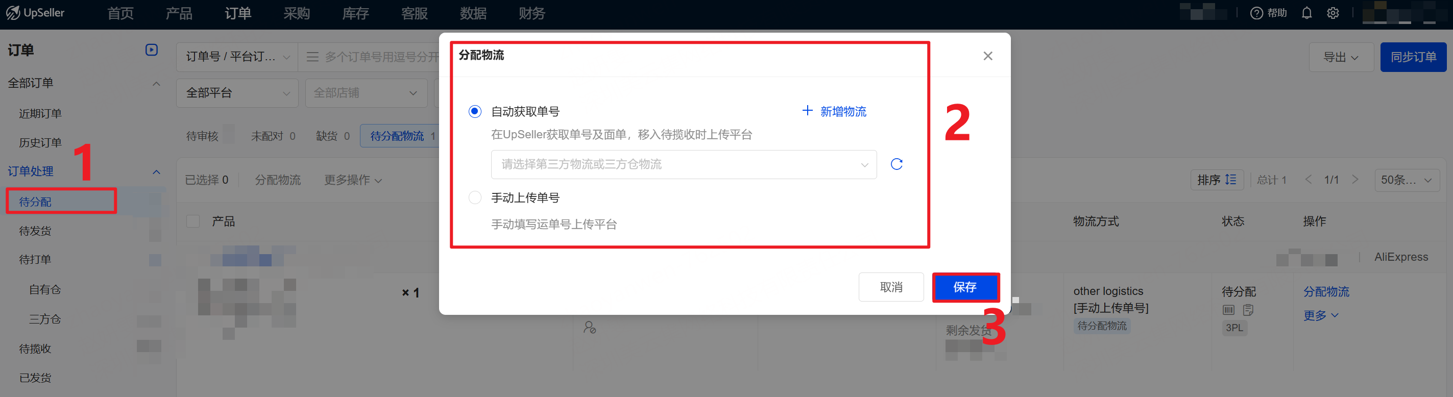 进入【待分配】>>选择“自动获取单号(需选择物流)或手动上传单号”>>保存