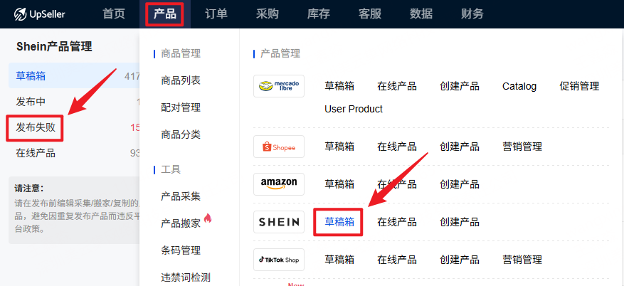 3. "草稿箱"和"发布失败"均支持批量编辑产品信息,只是可编辑的字段存在差异三、操作流程