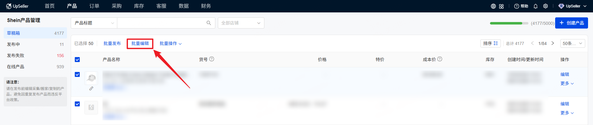 第二步:选择需要编辑的产品,点击“批量编辑”