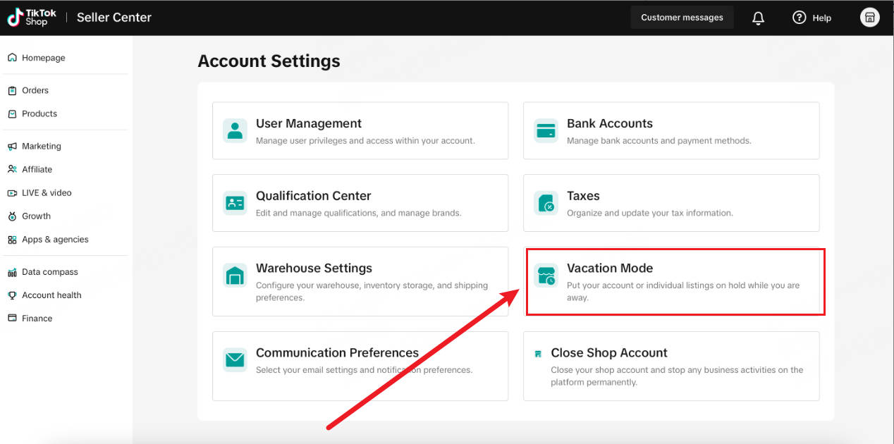 在卖家中心>>点击“账户”>>产品模块>>假期模式,即可开启