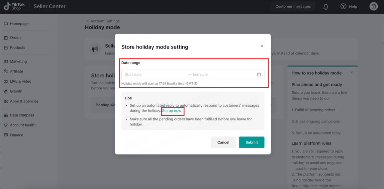 注意:至少提前3天激活假期模式。在开启假期模式之前,需要确保现有订单已处理,并且店铺里没有有效的促销活动。点击即可了解详情>> https://seller.shopee.com.br/edu/article/3324