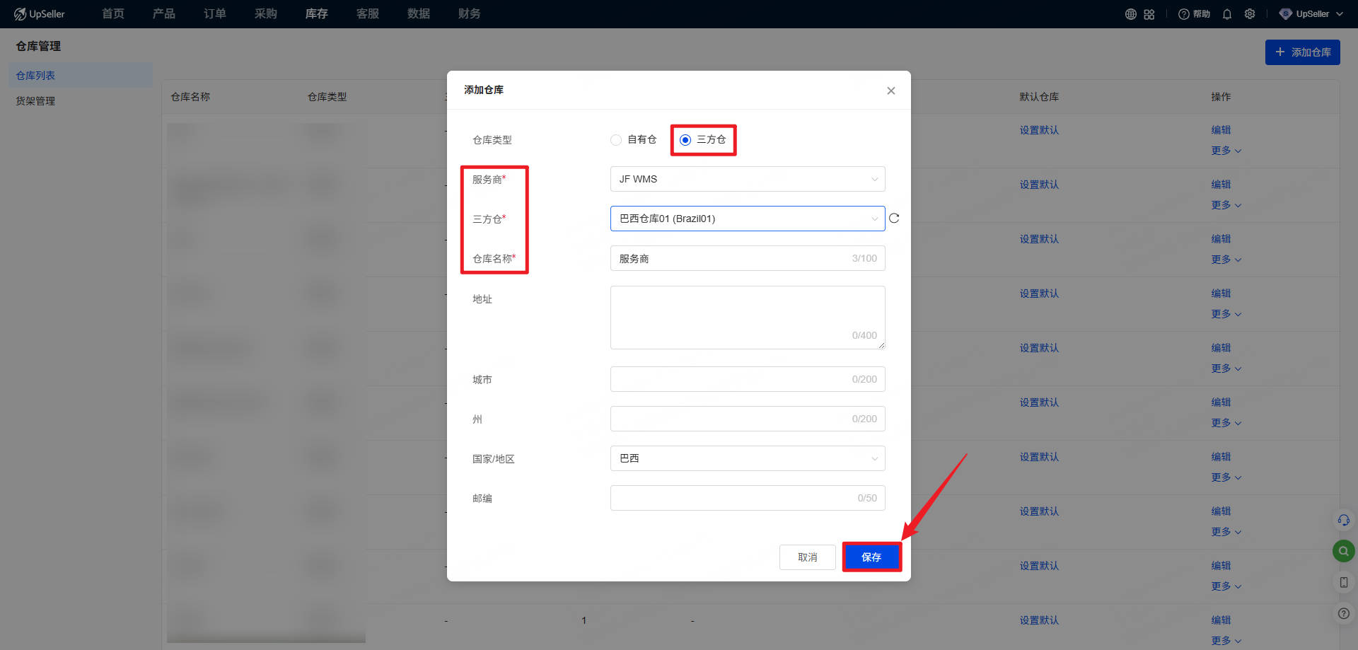 第一步:仓库类型选择“三方仓”,并完善相关仓库信息