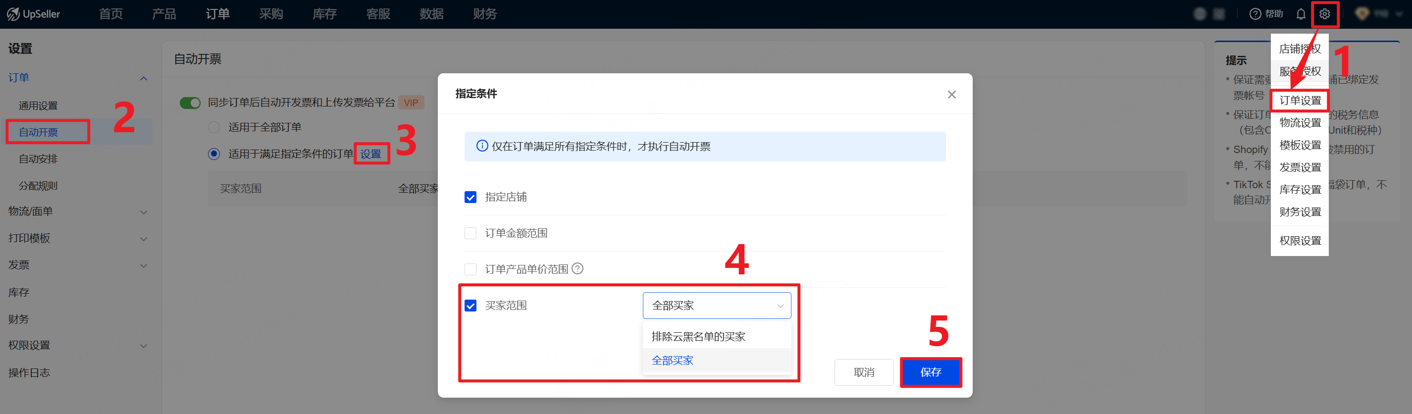 Q1:进入设置>>订单设置>>自动开票>>点击适用于满足指定条件的订单旁边的设置>>勾选并选择买家范围>>保存,即可完成设置