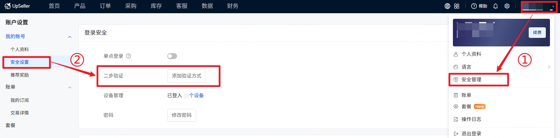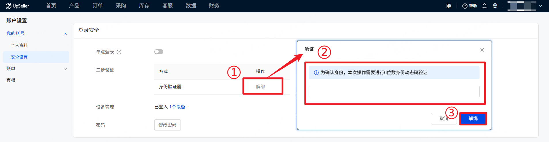 当开启了两步验证之后,登录UpSeller账号不仅需要输入账号和密码,还需要输入在身份验证器APP中显示的动态验证码,才可以成功登录