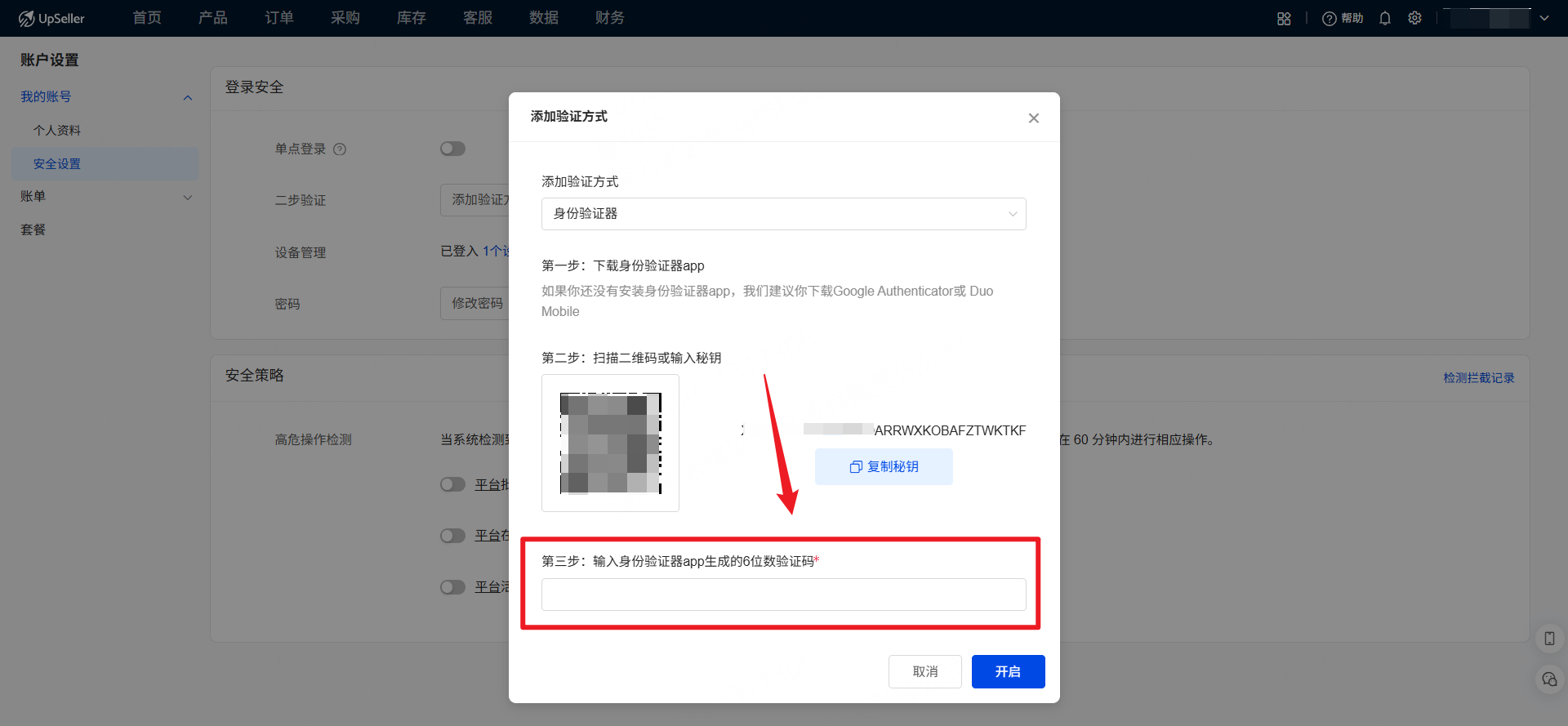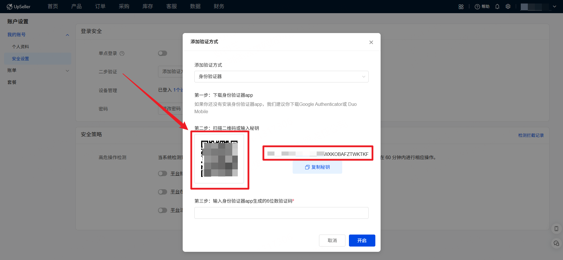 4.打开身份验证器APP,扫描UpSeller窗口里的二维码或者输入旁边的秘钥,进行身份验证的绑定