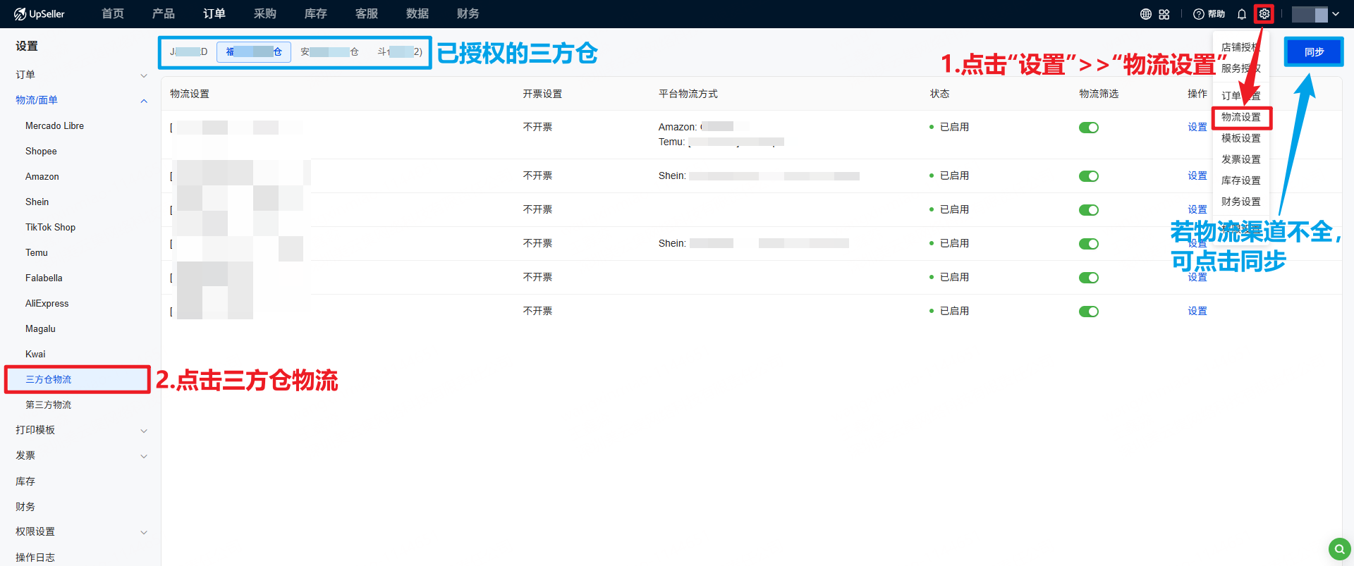 2.配置后可点击【设置】>>“物流设置”>>三方仓物流,查看已授权三方仓支持的线下物流渠道