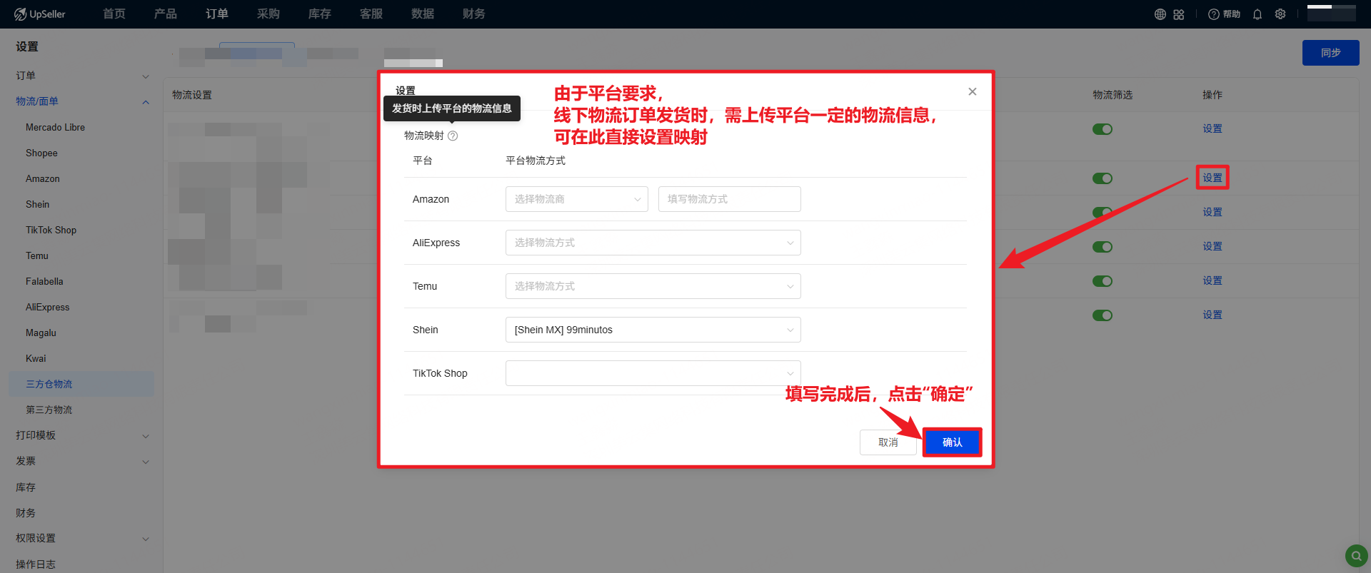 3. 点击单个物流旁的“设置”,可为 Amazon、Aliexpress、Temu、Shein、TikTok Shop 平台设置物流映射规则