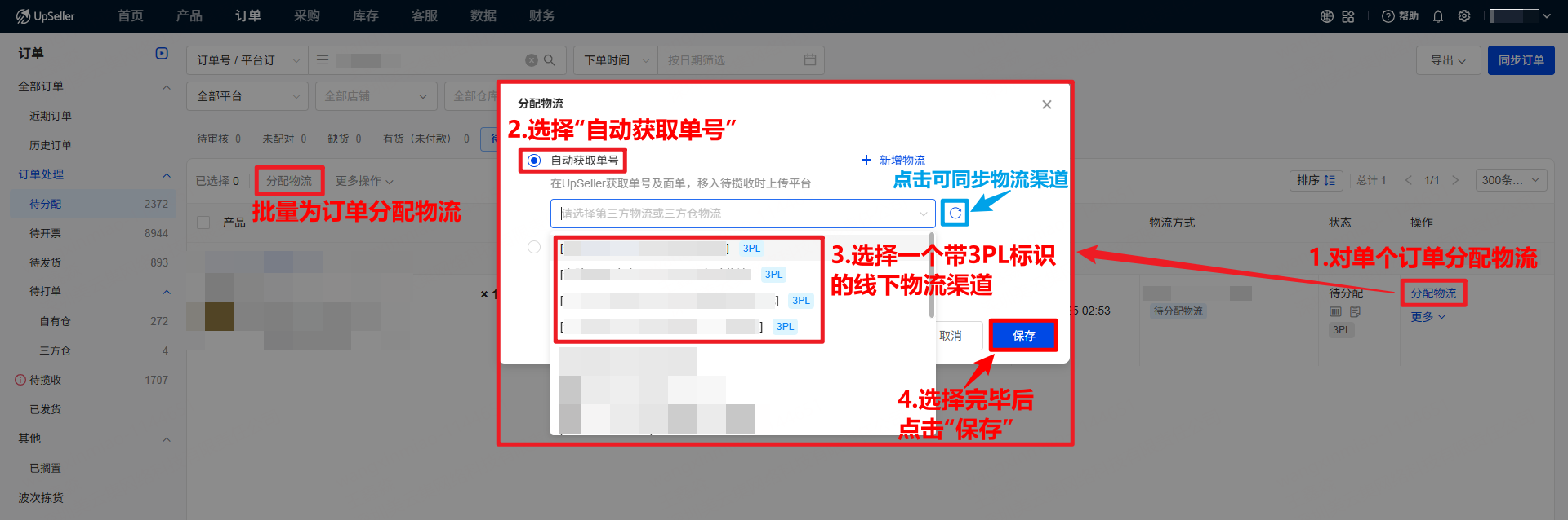 2.单个或批量为订单分配物流,点击“自动获取单号”,并选择物流渠道