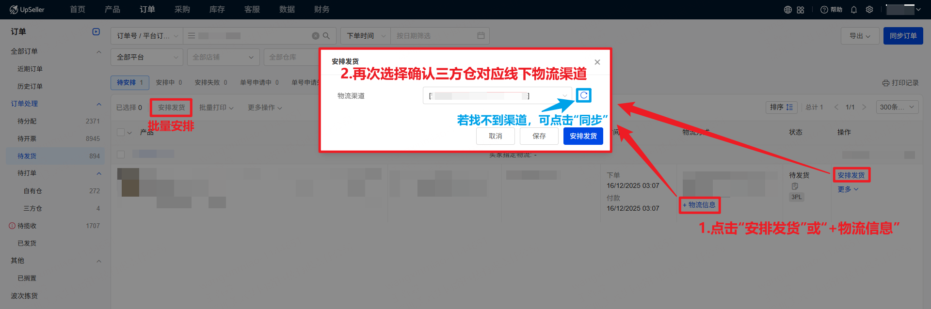 进入【待发货】>> 待安排 列表>> 点击“安排发货” ,并选择物流渠道。安排成功后,订单将自动推送三方仓。待三方仓处理订单后,UpSeller自动更新订单状态
