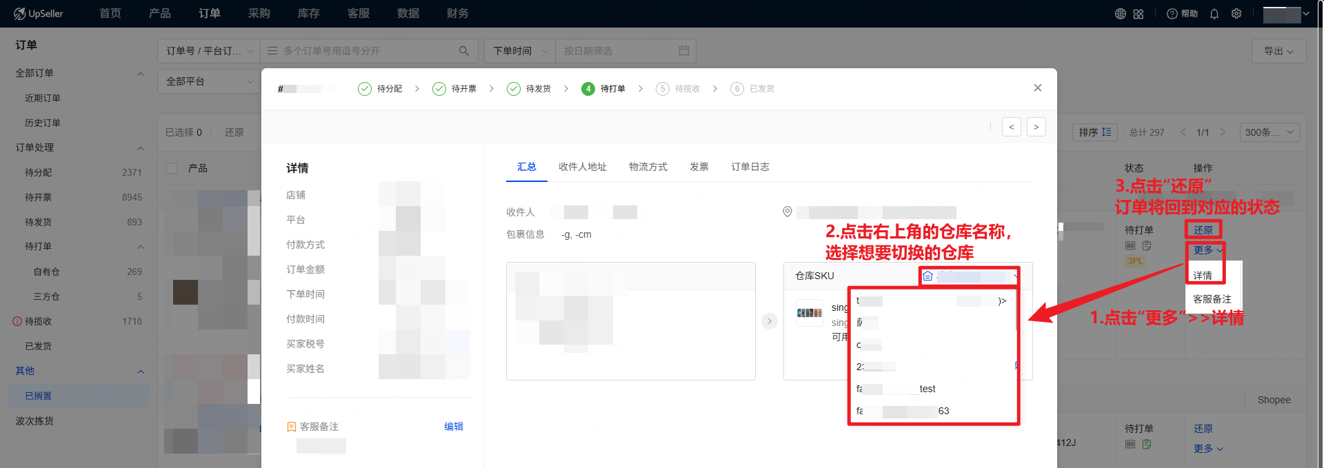 情况二:当订单处于【待打单】状态时,点击 更多>>搁置订单。订单进入“已搁置”状态后,才可切换仓库。切换仓库成功后,需点击“还原”,将订单还原至搁置前状态